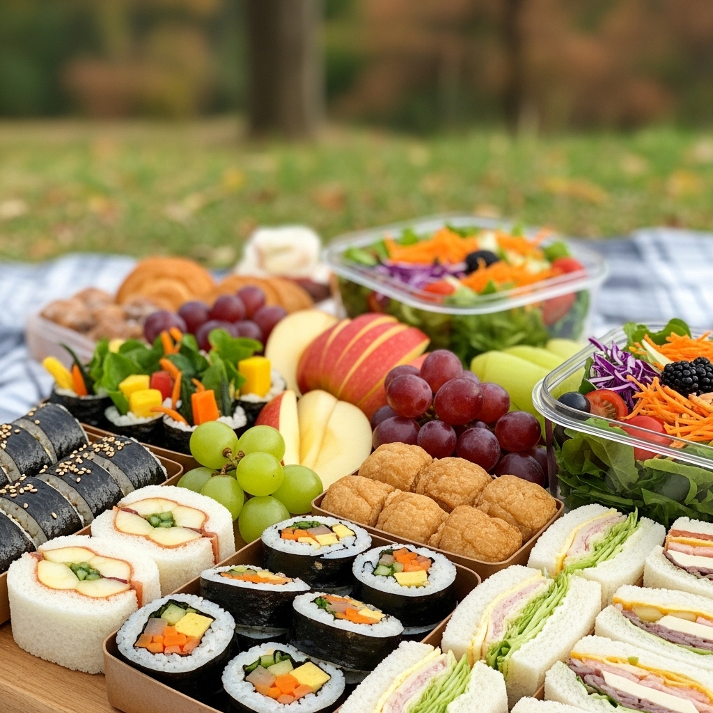 | 음식 & 음료 | 도시락 (김밥, 샌드위치 등), 과일, 물, 음료 | 보냉백, 컵, 수저/젓가락, 물티슈, 간식 |