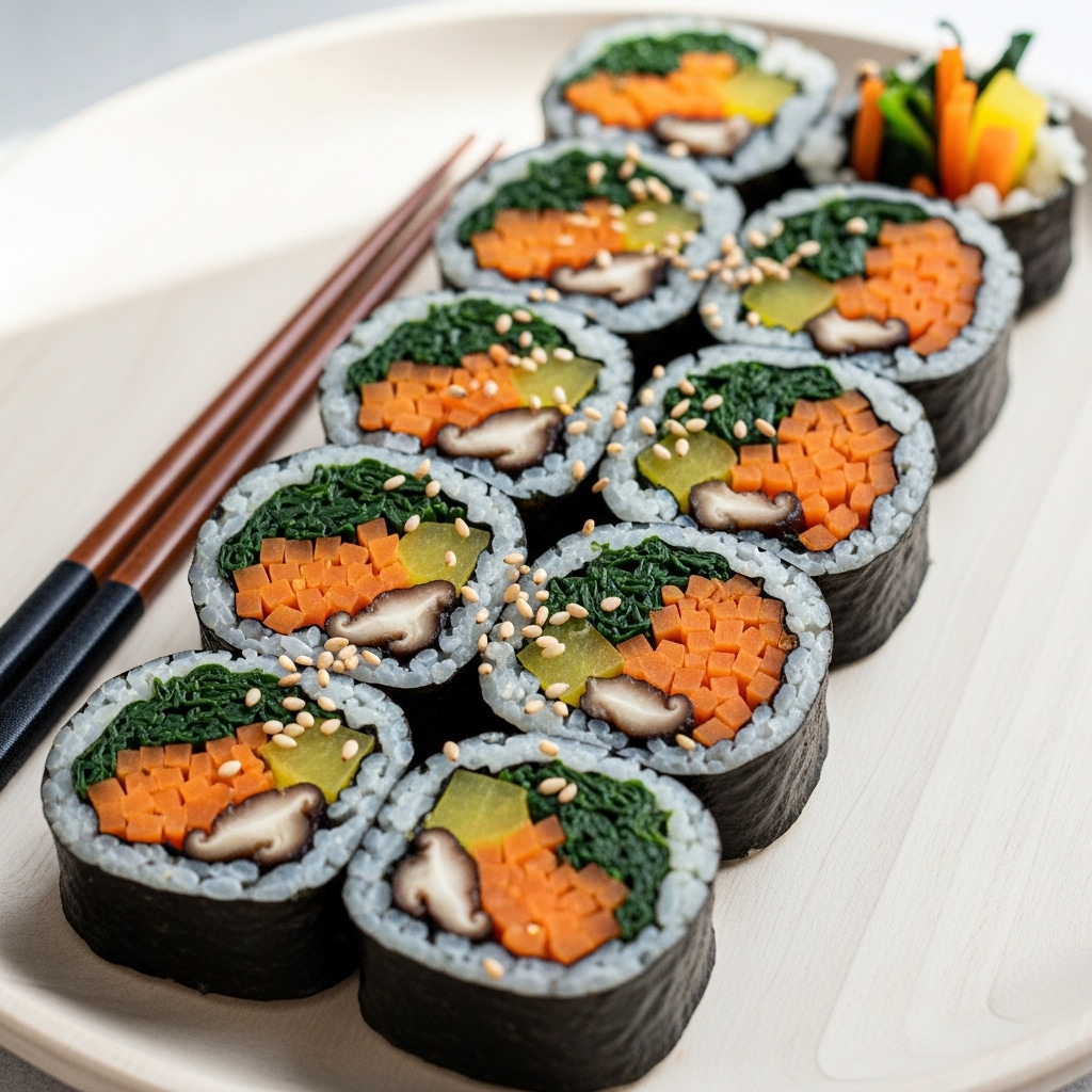 남은 나물로 만들 수 있는 가장 친숙하고 맛있는 메뉴 중 하나가 바로 김밥이죠! 고기 없이도 나물 자체의 맛과 향으로 충분히 풍성한 비건 김밥을 만들 수 있습니다.